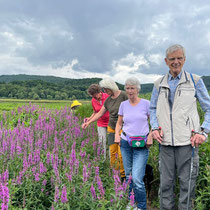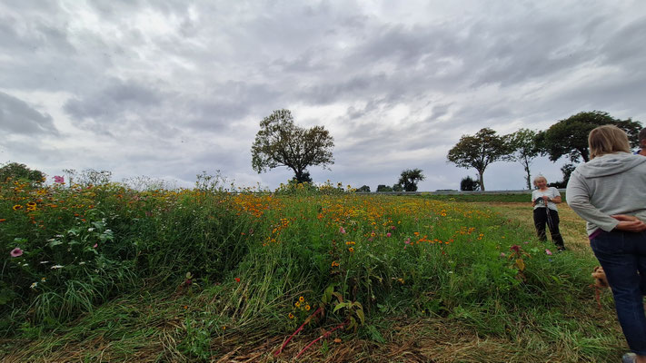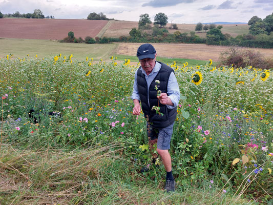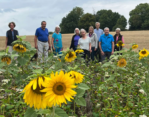 Auch im Spätsommer begrüßte uns die Natur noch mit einigen Besonderheiten. An mehreren Stellen in unserer Gemarkung blühen derzeit noch üppige Grünstreifen mit vor allen Dingen Buchweizen und Sonnenblumen. Ihnen haben wir diesmal einen ca. 5 km langen Besuch abgestattet. Besonders auffällig sind gerade die Sonnenblumen in ihrer leuchtenden Pracht. Mit leuchtenden Farben wurden wir auf unserer gemütlichen Wanderung begeistert und auch viele andere Naturbesonderheiten wurden uns fachmännisch nähergebracht. Mit 10 Teilnehmerinnen und Teilnehmern war unsere Donnerstagswanderung diesmal sehr gut besucht und man konnte sich unterwegs über alle möglichen Themen austauschen. Einige Eindrücke in der folgenden Bildergalerie.