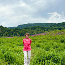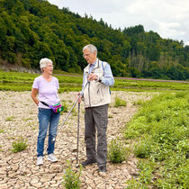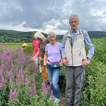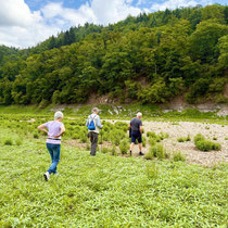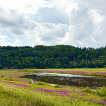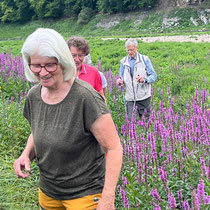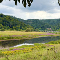 Der Blutweiderich und der Gilbweiderich waren in voller Blüte und verliehen dem leider fast leeren See eine besondere Farbenpracht. Nach einer nur kurzen Wegstrecke kamen wir zum eigentlichen Ederfluss. Vor der Kulisse des Steilhanges rauschte die Eder über das Kiesbett.